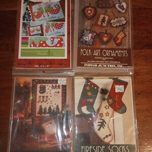Lot of 4 Holiday-themed fiber craft patterns or kits. I believe they are all OOP, all are vintage except one is only 14 years old. Includes: