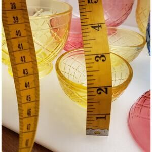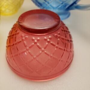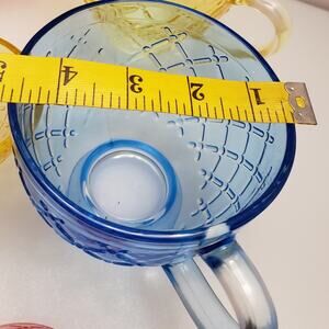 Lot of 4 decorative glass cups 12 oz and 4 small bowls 3 oz multi colored 1 red, 2 yellow 1 blue cups 2 yellow and 2 red bowls
