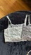 4 lace crop tops (2 off-white, 1 gray, 1 soft green). Crochet top is cream colored. Tag says Large, but it is a VERY SMALL Large. From a 30”-38” chest at most. Brand new, tried on and never worn. Really pretty.