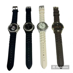 All watches have a rubberized band and all need batteries. Assorted brands - 2 Geneva 1 Vivani and 1 unknown