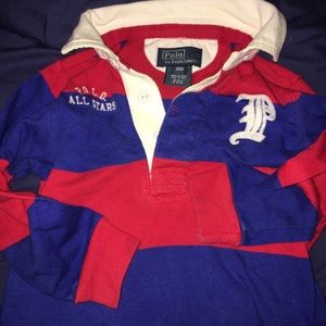 Long sleeve baby boy Ralph Lauren tops. One fleece lined orange hoodie, 1 button up plaid shirt, 2 rugby shirts. All in EUC. All authentic.