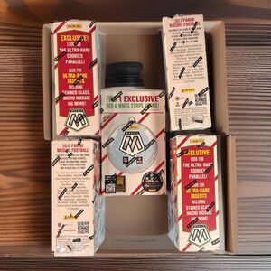 This product is a lot of five 2025 Panini NFL Mosaic holiday ornament boxes,