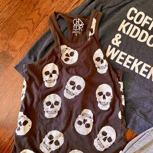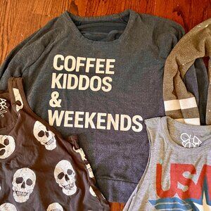 The skull and USA tops are size Small and the three sweatshirts are all size XS.