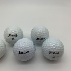 Improve your golf game with this diverse lot of 5 high-quality golf balls from top brands, including Callaway, Srixon, Titleist, and Noodle. Each ball offers its unique performance advantages: