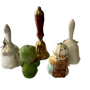 Lot of 5 various bells including 4 porcelain/ceramic and one brass/wood from an unknown brand. Diverse styles and materials make this an attractive collection for bell collectors. Comes from a smoke free home.
