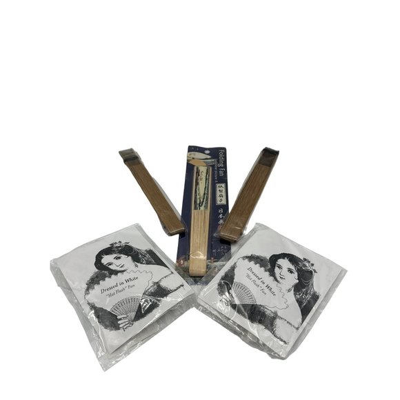 A set of 5 assorted handheld fans including 2 hot flash fans and Japanese fans. Perfect for cooling off during hot days or adding a touch of elegance to your decor.