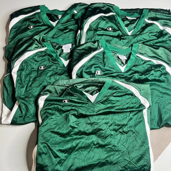 Lot of matching vintage Champion Authentic football-style jerseys.Green mesh construction with white side panels and embroidered Champion logo.V-neck design with short sleeves.Classic 1990s / early 2000s athletic teamwear.All jerseys are the same style and size.Made in Costa Rica.