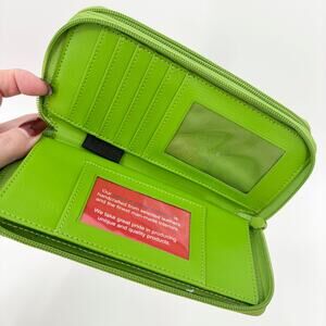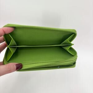 3. Green full-size genuine leather zip wallet with two sides and exterior pocket, measures 7.5" x 4" x 1.5"