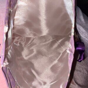 • Tarte: Pretty, satin-y makeup or lingerie bag branded with the Tarte logo. Measures about 11 x 13 inches with a purple ribbon drawstring closure. Lilac color patterned print. Brand new, never used.