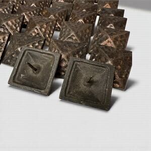 Add a bold, rustic touch to your next DIY project with this lot of 54 vintage bronze-rubbed pyramid clavos tacks. Measuring 1.5" x 1.5", these decorative nails are made of heavy cast iron (not lightweight aluminum) and feature a beautiful aged finish that complements farmhouse, Western, Spanish, or antique décor.