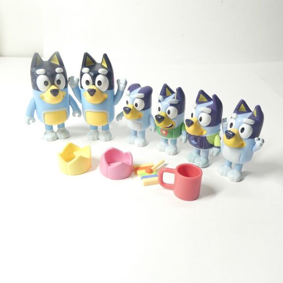 Lot of Bluey figures -- looks to include 2 of Bandit, and 4 of Bluey. They are 2-3 inches tall. Also included are several accessories -- a mug, 2 crowns, and xylophone. Good shape overall with some play wear as shown. One figure is missing his tail.