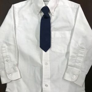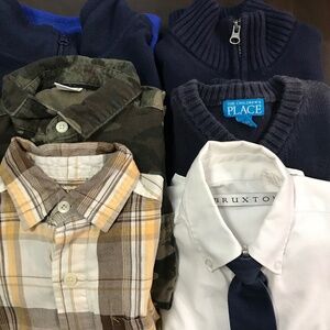 Lot of 6 Boys’ Shirts - White Button Down with navy tie size 5. This shirt has some wear on the sleeve cuffs. Arizona Button down plaid short sleeved - size 5. The other 4 are all size 5/6. 3 Children’s Place and 1 camo Crazy 8 long sleeved. The vest and zip-up are navy. The vest is a little worn, but overall the shirts are in good condition.