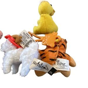 3 mini plush stuffed animals: Yellow duck, white dog from Hotel For Dogs, Winnie The Pooh dressed as Tigger