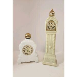 Set of 6 vintage Avon figural perfume bottles plus 1 lidded powder dish. Features milk glass and ivory tones in cat, clock, vase, and pillar designs. Items range from 5.25" to 9" tall. Light vintage wear consistent with age.