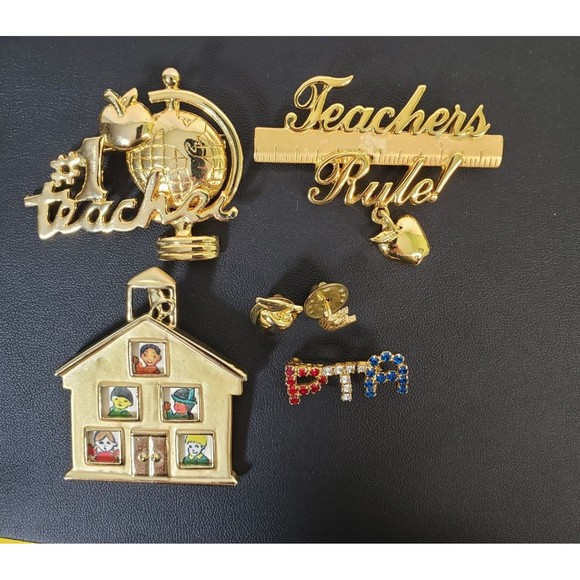 Lot of 6 Vintage Teacher School Brooches Pins Gold Tone PTA