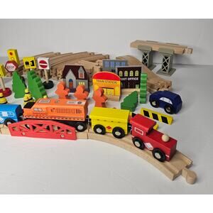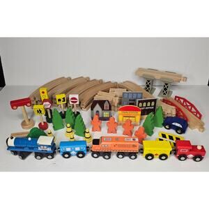 Lot of 63 Pieces Wooden Train Set Track Accessories People Signs Trees Gift