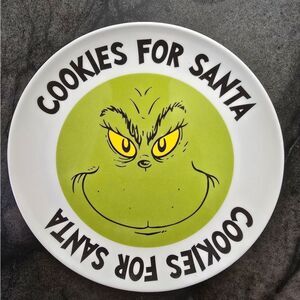 Make Santa laugh when you place treats on top of this Cookies For Santa Grinch Plate! Lurking in the center of the plate is none other than the Grinch himself, wearing a sneaky smile. Around the rim is the phrase "Cookies For Santa" in black font. Set this plate out on Christmas Eve to make Santa happy!