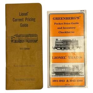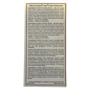 Delve into the captivating world of collectible trains with this wonderful lot of 7 Ladd and April Publications Greenberg's Lionel Train Guides from Guides for trains 1901 to 1988! This collection is a must-have for enthusiasts and collectors alike. The books are in fair to good condition, with some minor writing present in a few of them and loose binding on one. Please refer to the photos. Add this unique set to your collection today!