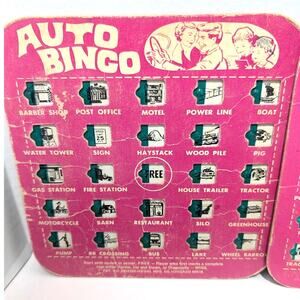 Get ready for a fun road trip with this lot of 7 vintage travel cardboard auto bingo cards by Regal Games! These classic bingo cards feature a colorful design in pink, blue, and green. They are in great vintage condition and ready for your next adventure. Perfect for family trips, car rides, or collectors of vintage games. Grab this set and add a touch of nostalgia to your travels!