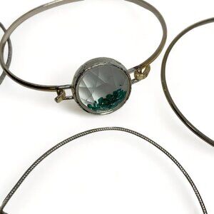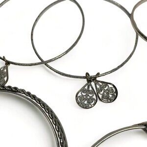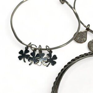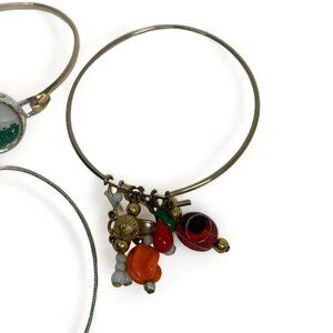 This listing is for a lot of 8 assorted charm bangle bracelets, all in silver tone metal featuring a variety of charms. Included in this lot is one snow globe style bangle with green beads, 2 silver bangles each with dual filagree teardrop charms, a triple bangle with hand of Fatima and beads, a bangle with 4 lucky clovers, a bangle with heart charm, a bangle celebrating Savannah and a bangle with assorted red, gold and faux pearl beads. All in very good preowned condition.