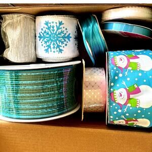 New and used This lot of 8 decorative holiday ribbons features a snowman design with glitter accents, perfect for adding a festive touch to your Christmas decor. The wire-edged ribbons are made of polyester and come in blue and silver colors, making them versatile for various crafting projects. The single-sided printed ribbons are sure to add a touch of holiday spirit to your creations, whether used for gift wrapping, wreaths, or other festive decorations.