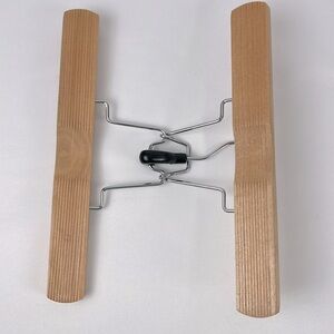 Keywords: wood pant hangers, skirt hangers, vintage hangers, metal arm clamp hangers, clamp hangers, closet organizers, clothing storage, wooden hangers, hanger lot, grip hangers, retro hangers, home organization, closet accessories