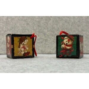 Set of 9 Vintage Christmas Ornaments, some hand made. 7 cloth, handmade ornaments, 2 small cardboard box ornaments with images of teddy bears. Santa Clause in set shows signs of age with yellowing of fabric, small stain on both sides of this ornament, see photos for detailed description. Please don't hesistate to reach out with any questions.