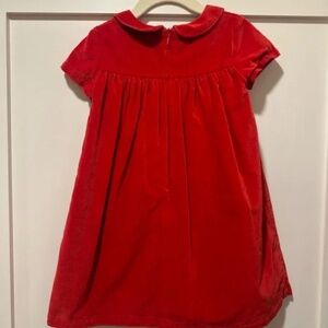 Glittering dots highlight the smocked bodice of a sweet velvet dress completed with a classic Peter Pan collar. • Size 3-4t • Color: Red Velvet with Gold Dot stitching • Used but good condition (no stains) • Back zip closure • Lined with an adorable Christmas pattern inside and under collar • Fiber content: 100% cotton • Machine Washable