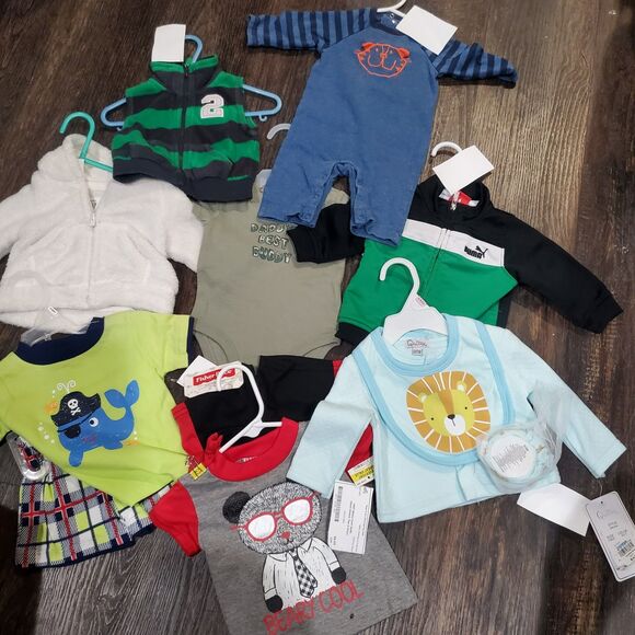 Lot of boys size 0/3 month clothing lot. A few are new with tags. (The square white tags you see are consignment tags and will be removed). A couple new short and shirt sets. And other pieces.