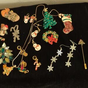 .Lot of Christmas Costume Jewelry Sold As Is. Pins, Earrings, Charms, and a Necklace. Pre-owned, some of these are vintage and some newer. Great to give away attached to gifts, stocking stuffers or just to wear yourself.