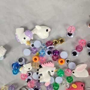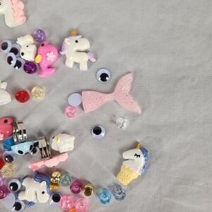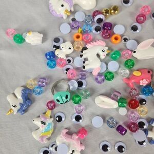 This lot has so many cute embellishments for your crafts. There are plastic/acrylic unicorns, bunnies, whales, cows, a mermaid tail and a sheep. Rings with lady bugs, bunnies and teddy bears. Misc plastic beads, google eyes. Everything is clean. I did not count how many pieces there are. Please refer to photos. A ruler was used to help you with sizes.
