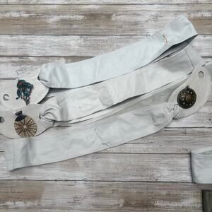 Leather Bands are between 38” - 43” long. They are tied and glued to the buckle.