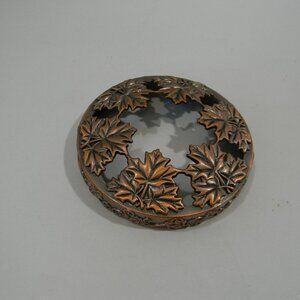 Copper toned candle topper. Metal with leaf design. Fits Yankee Candles or other jarred candles (approx 3.25 inches diameter.)