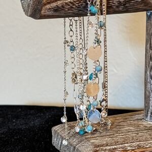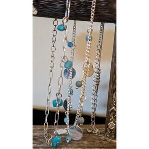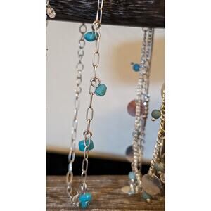 Lot of Five Silver Tone Delicate Ankle Bracelets. All in like new condition. One is a chain link. One has dangling crystals, one has small moveable beads, one is a rolo link with turquoise look chip dangles, and one has disk and turquoise look ball bead dangles. Sold together as is. All have extender chains so you can adjust to your size.
