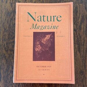 Color covers, B&W articles. American Nature Association published Nature Magazine from 1923 to 1959. Founded by Arthur Newton Pack & his father, Charles. Nature Magazine was an "illustrated monthly w/ popular articles about nature" and the "interpreter of the great outdoors." A May 1924 review of the organization & its magazine, written by Carroll Lane Fenton & published in American Midland Naturalist called the magazine "excellent" w/ "abundant pictures, admirably printed"; and said it was a "highly worthwhile publication" that deserves a wide circulation among town and school libraries.