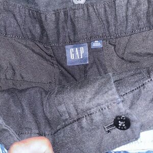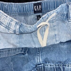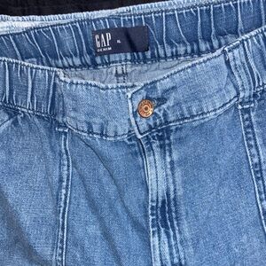 All by The GAP. Four pairs of different style women’s size XL shorts. One pair is a darker casual light blue jean with half an elastic waistband and utility pockets, second pair is a lighter denim with a cream colored drawstring and elastic waistband. Both denim pairs are a relaxed fit and utility design. Ideal for everyday wear. The third pair is a linen and viscose blend with a zip and clip closure with pleats, making them a bit dressier than the last black pair which has a zipper and button closure with elastic waistband and the same utility look as darker denim pair. All size XL. All have no flaws and worn once or twice.