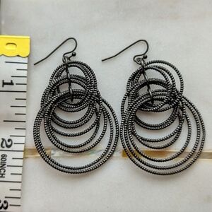 Chic Lia Sophia necklace with silver discs, size 8 pink & white color block ring, owl stud earrings, and black metal chandelier earrings.
