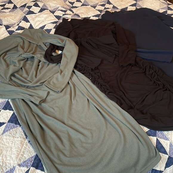 3 nursing / maternity dresses- two size small nursing dresses and one size medium maternity dress. In great shape. Colors are sage green, black, and navy blue.