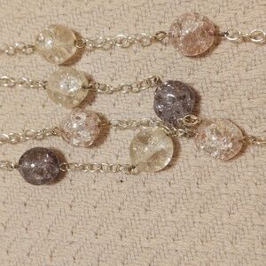 Three Necklaces The first is black toned metal The seconds is beads of gray and pink The last is orange and clear squares.