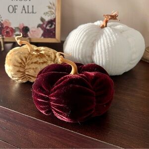 Set of three decorative pumpkins in plush velour & ribbed knit. Includes burgundy, gold, and white colors. Metallic gold stems.