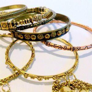 This lot of bangle bracelets are fashioned in brass and copper with two of them having little dangles and the other each with a different design. Bangles measure approximately 2 5/8" in diameter and are in beautiful condition!