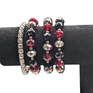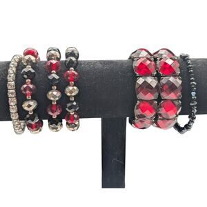 Lot of Six Red Black Metallic Rhinestone Beaded Stretch Bracelets. Pre-owned, this lot of bracelets is in various conditions and being sold as is. All wearable to excellent condition. The items chosen for my lots are items I previously had set aside to sell but decided to lot up due to a high volume of inventory. Because they are lotted up and at a reduced price, I have not taken the time to clean them or closely inspect them.