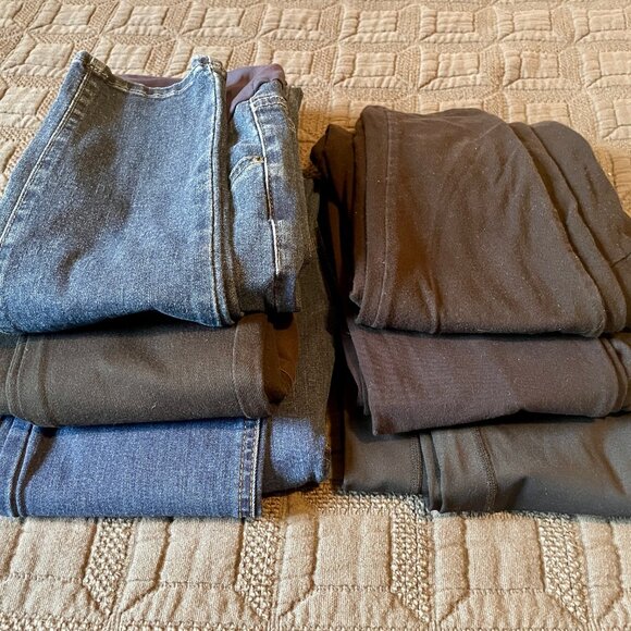 6 size medium maternity pants, over the belly. 3 pairs of jeans (2 blue, 1 black) and 3 pairs of black leggings.
