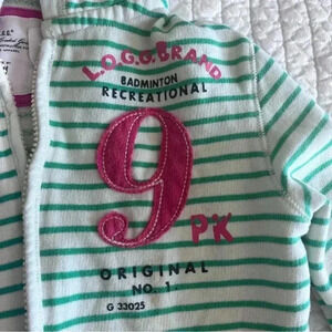 H&M L.O.G.G. size 10/12 green and white striped with badminton logo.