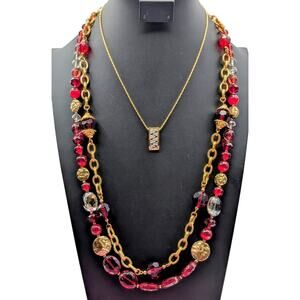 Lot of Three Coordinating Gold Tone & Red Bead Necklaces. Pre-owned, this lot of necklaces is in great condition. Vintage to modern pieces. Wear together, separately or mix and match with other pieces in your jewelry wardrobe.