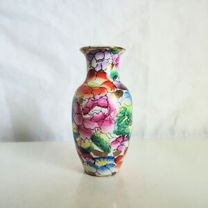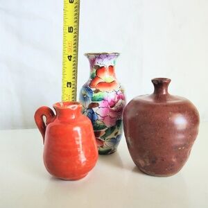 Here's a lovely lot of three mini vintage vases. There's two mini pottery vases and one hand painted porcelain mini vase. All the vases are in vintage condition with some minor chips shown in the photos.