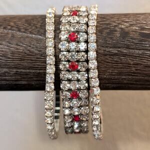 Lot of Three Rhinestone Stretch Bracelet. Pre-owned, these bracelets are in excellent condition. The three row bracelet is dotted with red rhinestones. Wear them separately or together or mix and match them with others.