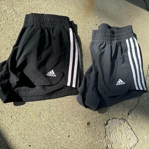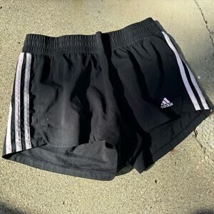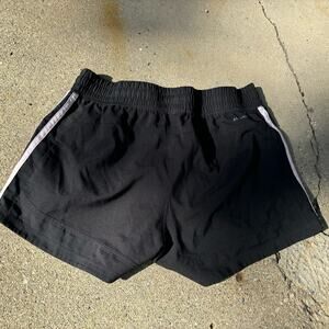 Women’s adidas shorts in black and gray with white stripes down the sides of the legs. Size small