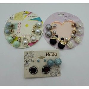 Lot of Womens Pierced Earrings 12 Pairs of Carded Earrings. These sets appear unworn and new, the packaging shows wear and has some discoloration here and there. The Mudd brand set has a gold back on one of the earrings. They all appear in good shape.