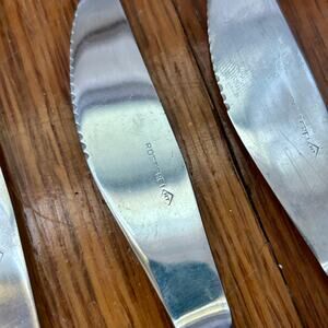 Vintage lot of five mid-century flatware pieces with wooden and faux wood handles. This set includes 3 butter knives, 1 fork, and 1 spoon. Perfect for adding a retro touch to your table setting or for collectors of vintage flatware.